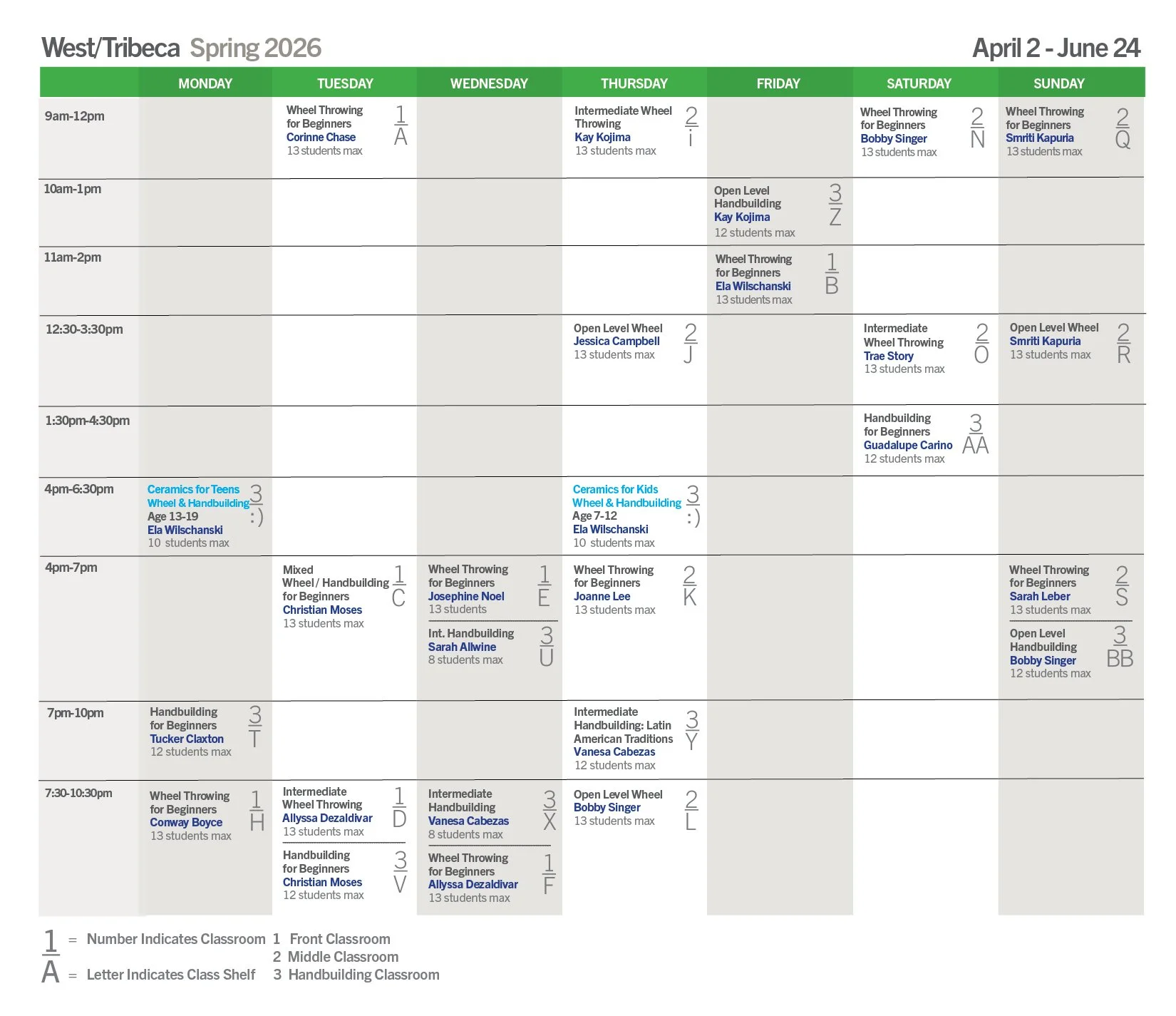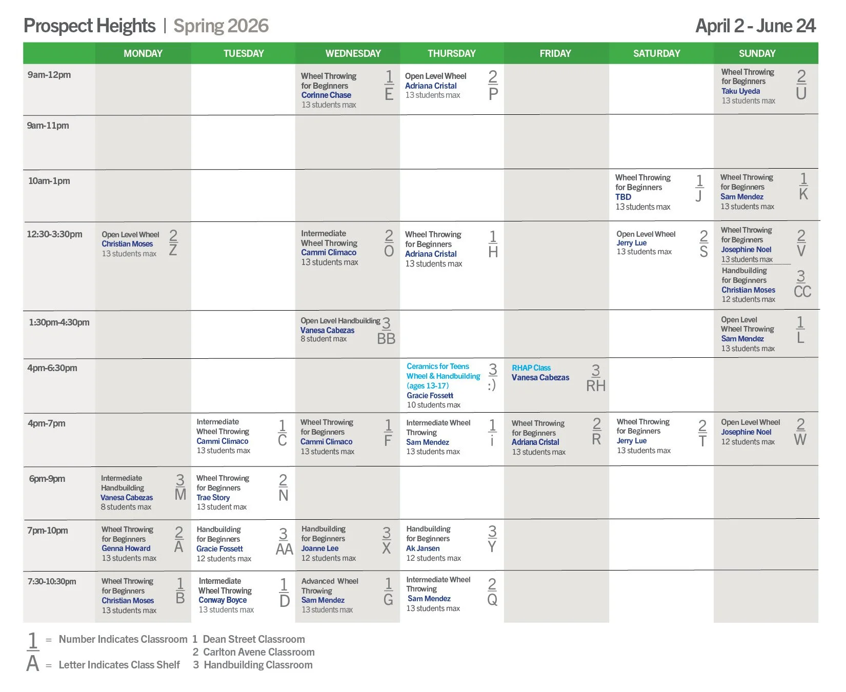 To see the full schedules for Winter or Spring, go to bklynclay.com/schedule
